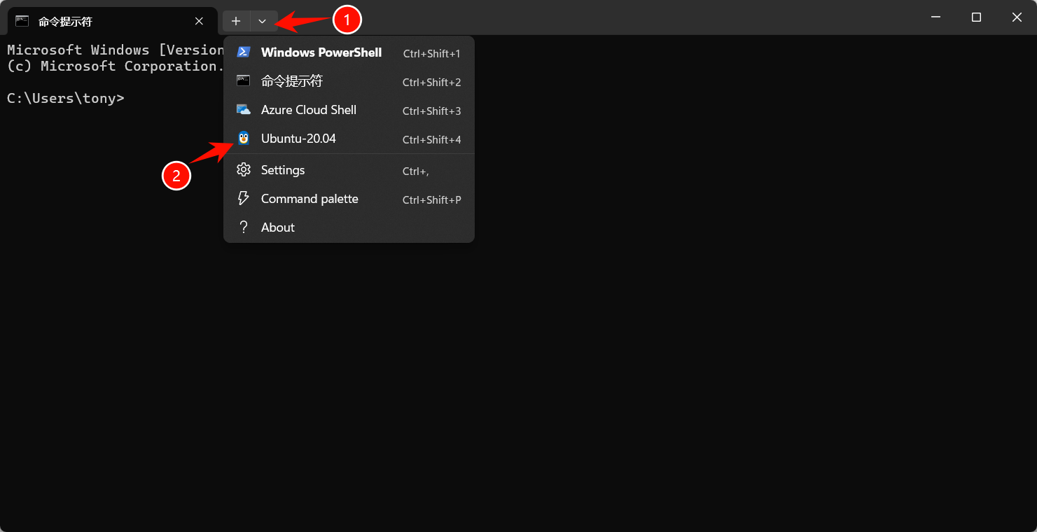 - 要重新进入Ubuntu系统可以通过在windows终端的下拉箭头菜单里直接进入